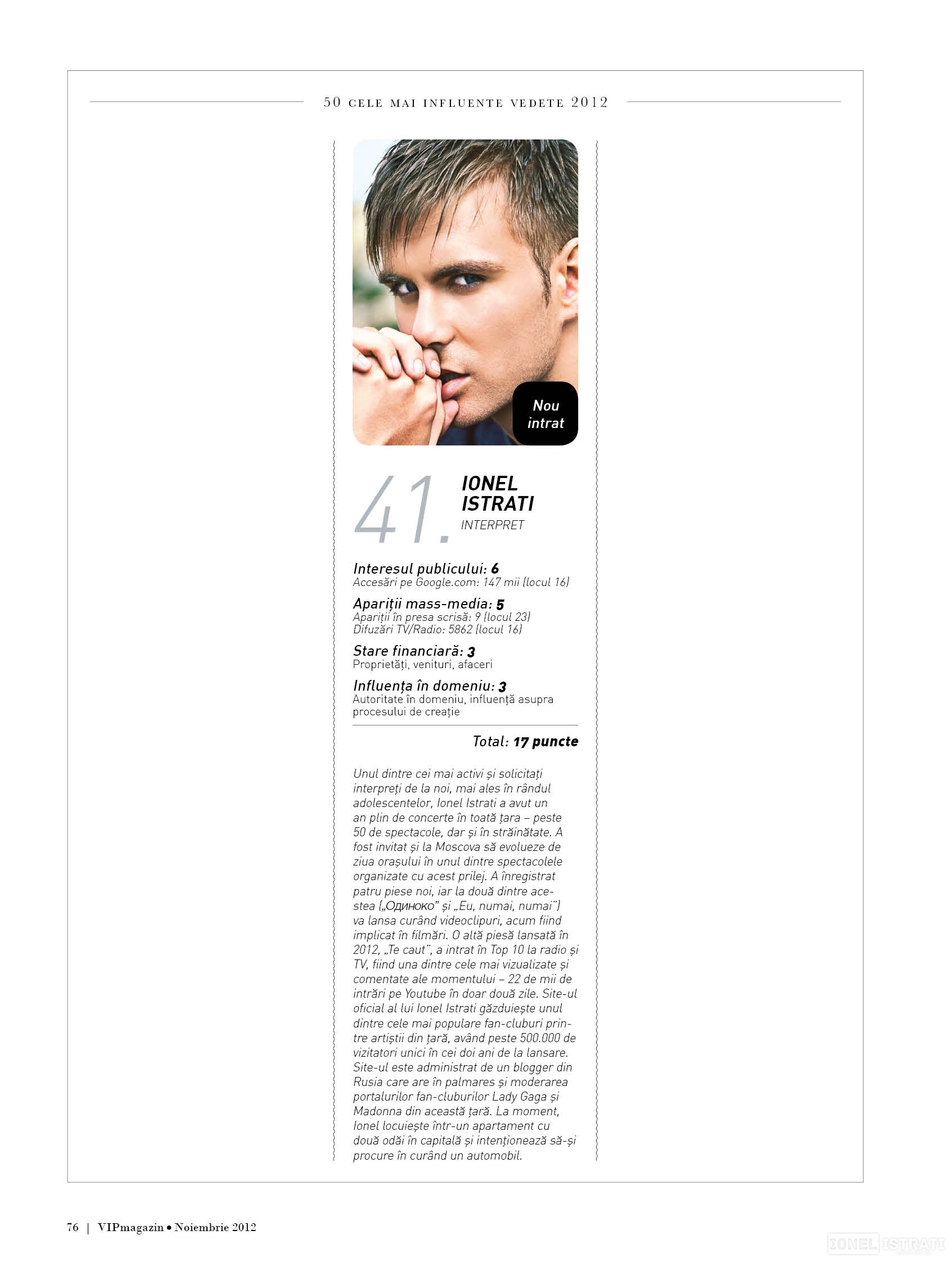 I. Istrati in Top 50 cele mai influente vedete 2012 din R.Moldova! VipMagazin (noiembrie)