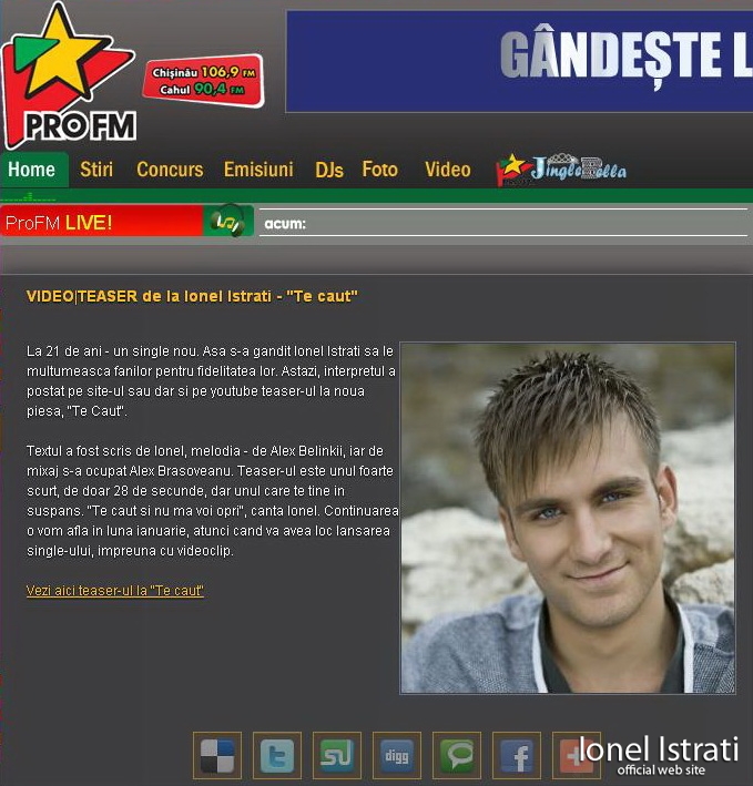 În ianuarie 2012 fostul concurent de la “Vocea României”, Ionel Istrati va lansa un nou videoclip la piesa “Te caut“. Basarabeanul în vârstă de 21 de ani vrea să aibă o carieră şi în România. Smiley i-a promis atunci când a fost eliminat din concursul de la Pro TV că vor colabora. Textulul piesei a fost scris de Ionel, melodia – de Alex Belinky, iar de mixaj s-a ocupat Alex Braşovean. Teaser-ul este unul foarte scurt, de doar 28 de secunde, dar unul care te ţine in suspans. “Te caut şi nu mă voi opri”, cântă Ionel. Continuarea o vom afla în luna ianuarie, atunci când va avea loc lansarea single-ului, împreună cu videoclipul. Până se va concretiza acest lucru vă invităm să vedeţi teaserul videoclipului şi să ne spuneţi părerea voastră. clik aici: bravonet.ro