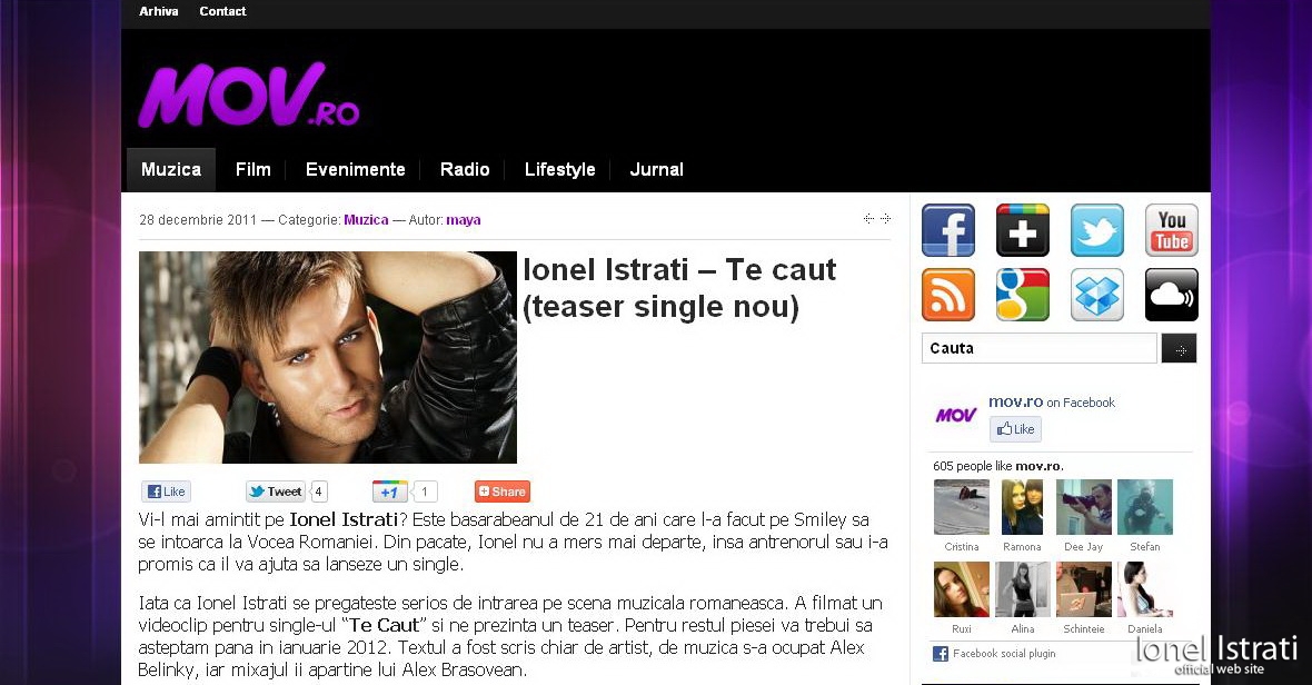 Iata ca Ionel Istrati se pregateste serios de intrarea pe scena muzicala romaneasca. A filmat un videoclip pentru single-ul “Te Caut” si ne prezinta un teaser. Pentru restul piesei va trebui sa asteptam pana in ianuarie 2012. Textul a fost scris chiar de artist, de muzica s-a ocupat Alex Belinky, iar mixajul ii apartine lui Alex Brasovean. click aici: www.mov.ro